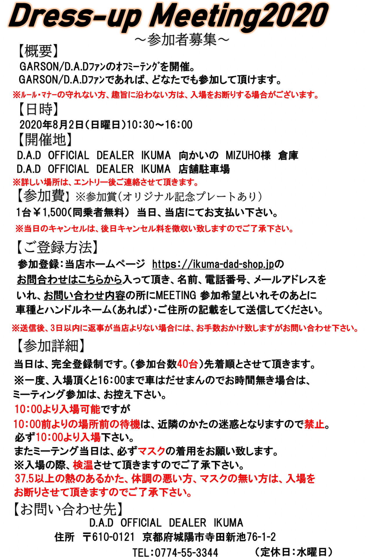 イベント情報 2020/07/23 その1 サマーキャンペーン キャンペーン情報その1は✨✨ 8月2日(日曜日)に IKUMAにてドレスアップミーティングを開催します? D.A.D好きな方は、是非ご参加下さい? なお、先着40台限定となります。 台数に達成次第、募集終了となりますのでご了承下さい。 ※返信には、時間を頂いております。 またコロナの状況によっては、延期及び中止になる場合もございます。